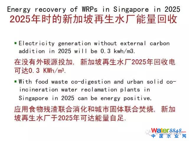 到2025年的時(shí)候,新加坡再生水廠的能源回收在沒(méi)有外加碳源的情況下可以達(dá)到0.3千瓦時(shí)每立方米污水。應(yīng)用食物殘?jiān)统鞘泄腆w廢棄物的協(xié)同焚燒,整個(gè)新加坡污水處理廠包括新生水廠可以達(dá)到能源自給,從而實(shí)現(xiàn)新加坡污水能源回收的第三版。