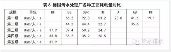 植物處理工藝和不曝氣氧化塘工藝的單位耗電量是最低的。帶有污泥厭氧穩(wěn)定的活性污泥法BF是第三級(jí)以上規(guī)模污水處理廠主要工藝,其單位耗電量低于帶有污泥好氧穩(wěn)定的活性污泥法,但是差距不大。相對(duì)SBR工藝單位耗電量就比較高,這與其沒有有效地將曝氣與攪拌結(jié)合起來(lái)有關(guān)。生物濾池工藝的耗電量低于活性污泥法工藝。各種工藝單位耗電量情況詳見表6。
