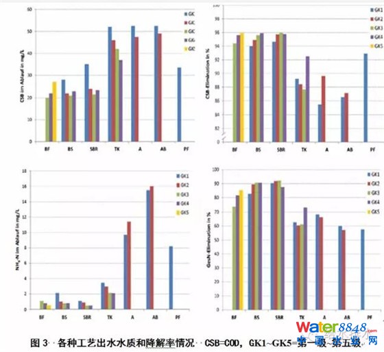 上述各種工藝在德國(guó)使用情況的調(diào)查詳見表5。各種工藝出水水質(zhì)情況詳見圖3。