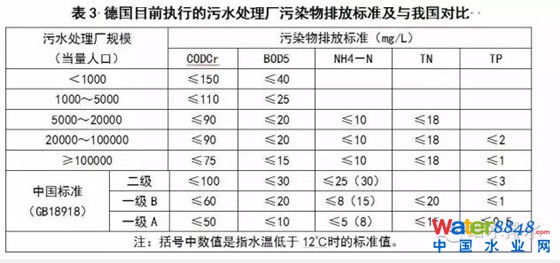 從90年代初開始,德國(guó)污水處理廠要求進(jìn)行除磷和除氮,1991年德國(guó)當(dāng)時(shí)的“Abwassertechnisch enVereinigung e.V”(ATV——污水技術(shù)協(xié)會(huì))發(fā)布了《ArbeitsblattA131—Bemessung von einstufigen Belebungsanlangen ab 500 Einwohnerwerten》(5000當(dāng)量人口以上一段活性污泥法計(jì)算規(guī)程——A131)拉開了德國(guó)污水處理廠除磷、除氮的序幕。從圖2可以看出,德國(guó)污水處理廠出水污染物濃度自90年代急劇現(xiàn)將,表明除磷除氮改造取得了明顯成效。近年來(lái),德國(guó)污水處理廠出水COD、NH4—N、TN和TP值分別穩(wěn)定在28、1.6、9、0.7mg/L左右。除總磷外,其余主要指標(biāo)均優(yōu)于我國(guó)《城鎮(zhèn)污水處理廠污染物排放標(biāo)準(zhǔn)》出水一級(jí)A標(biāo)準(zhǔn),詳見表3。