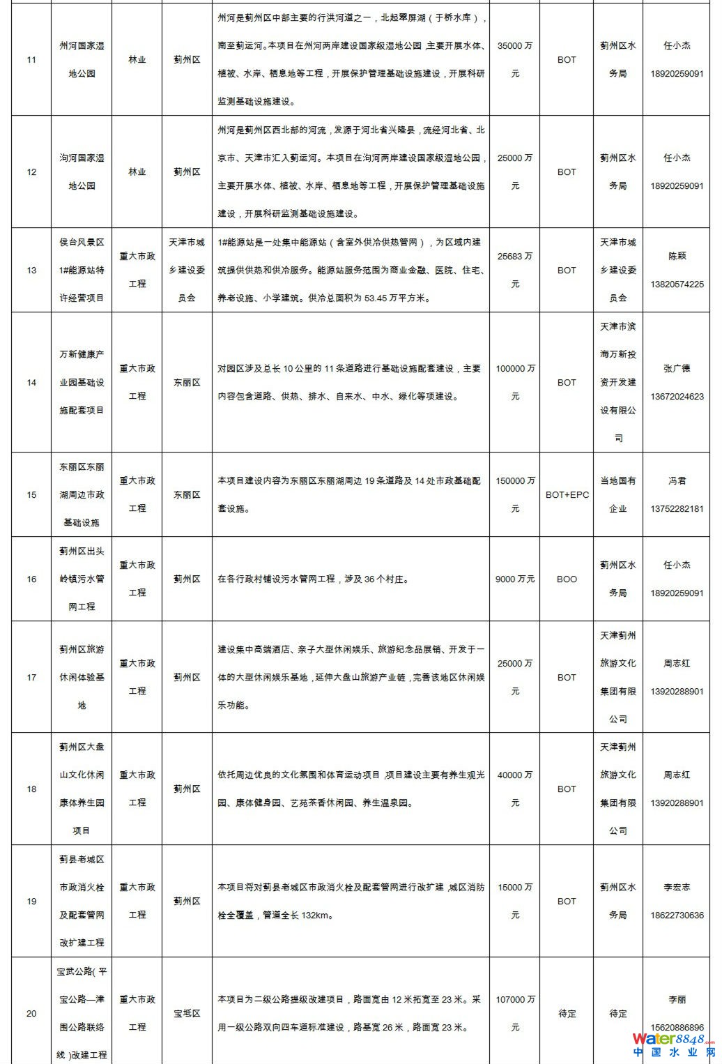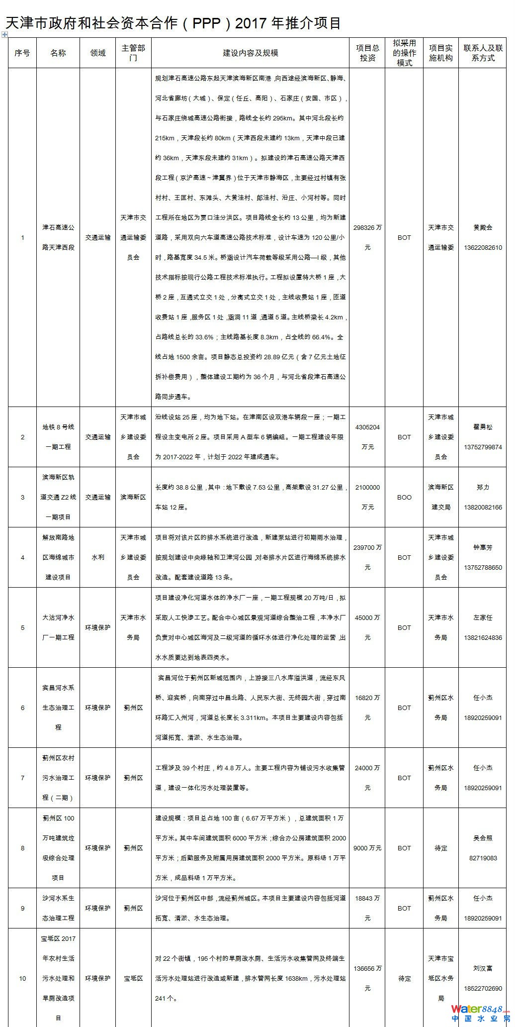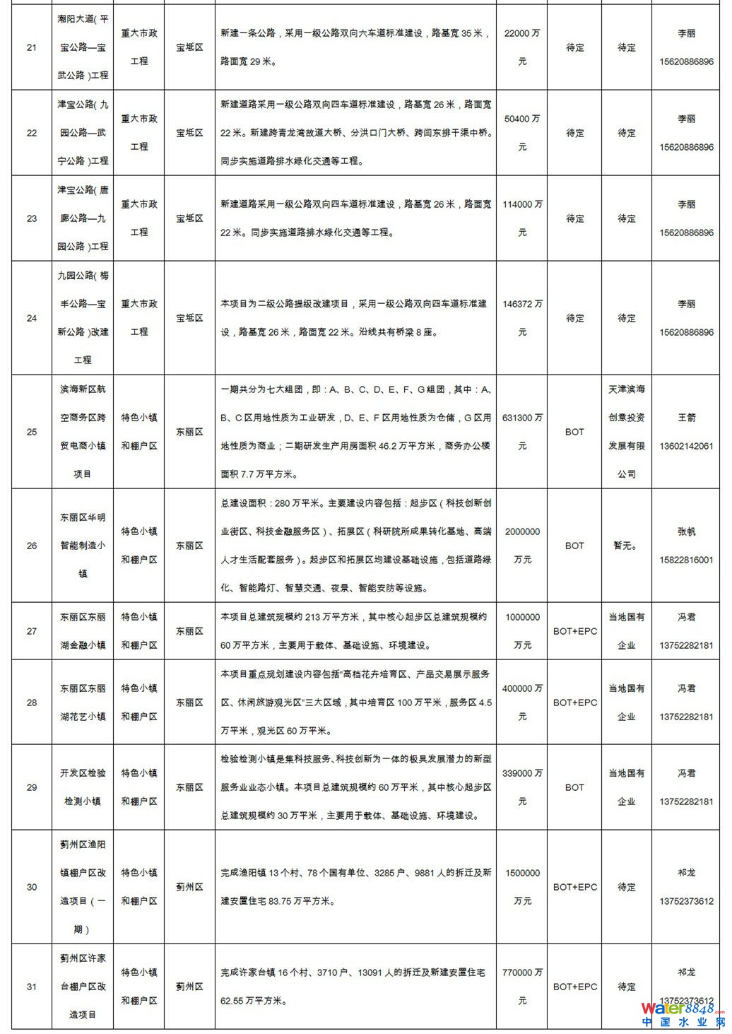 在此次公布的項目中,包括津石高速公路天津西段項目,該項目東起天津濱海新區(qū)南港,向西途經(jīng)濱海新區(qū)、靜海、河北省廊坊(大城)、保定(任丘、高陽)、石家莊(安國、市區(qū)),與石家莊繞城高速公路銜接,路線全長約295公里,項目靜態(tài)總投資約28.89億元,整體建設(shè)工期約為36個月,與河北省段津石高速公路同步通車;地鐵8號線一期工程項目,沿線設(shè)站25座,均為地下站,一期工程建設(shè)年限為2017-2022年,計劃于2022年建成通車;濱海新區(qū)軌道交通Z2線一期項目,長度約38.8公里,其中地下敷設(shè)7.53公里,高架敷設(shè)31.27公里,車站12座;解放南路地區(qū)海綿城市建設(shè)項目,將對該片區(qū)的排水系統(tǒng)進行改造,新建泵站進行初期雨水治理,按規(guī)劃建設(shè)中央綠軸和衛(wèi)津河公園,對老排水片區(qū)進行海綿系統(tǒng)排水改造,配套建設(shè)道路13條。大沽河凈水廠一期工程項目,建設(shè)凈化河道水體的凈水廠一座,一期工程規(guī)模20萬噸/日,擬采取人工快滲工藝,配合中心城區(qū)景觀河道綜合整治工程,該凈水廠負(fù)責(zé)對中心城區(qū)海河及二級河道的循環(huán)水體進行凈化處理的運營,出水水質(zhì)要達到地表四類水。