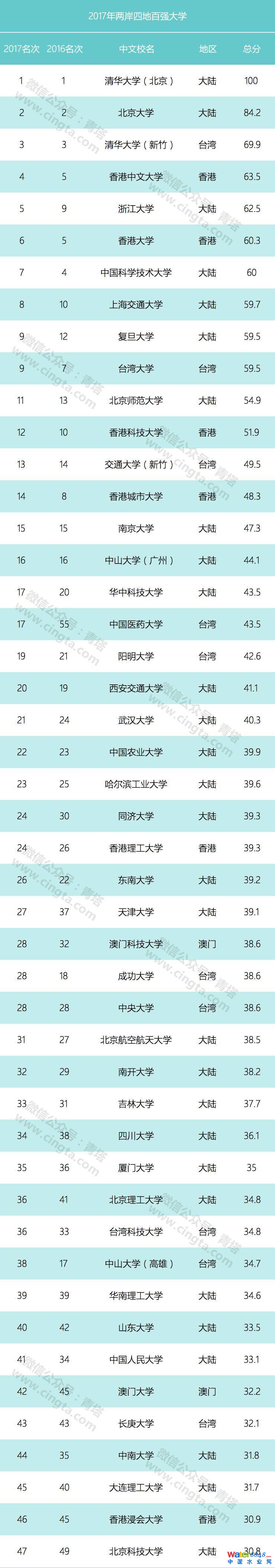 2017年中國(guó)兩岸四地大學(xué)百?gòu)?qiáng):清華、北大領(lǐng)跑