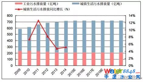 我國污水分為工業(yè)和城鎮(zhèn)生活兩部分,中國環(huán)境統(tǒng)計年鑒數(shù)據(jù)顯示,2009年-2014年我國工業(yè)污水排放量基本維持在210億噸/年左右,城鎮(zhèn)生活污水排放量自354億噸增長至510億噸。保守估算,按照工業(yè)污水排放量每年210億噸,城鎮(zhèn)生活污水排放量年增長率4%計算,則2020年我國污水排放總量將達到855億噸。2014年,我國工業(yè)污水有效處理率為96%,城鎮(zhèn)生活污水有效處理率為97%,2014年工業(yè)污水處理量為200億噸,城鎮(zhèn)生活污水處理量為495億噸。假設(shè)污水有效處理率保持不變,則2020年工業(yè)污水處理量為200億噸,城鎮(zhèn)生活污水處理量為626億噸。