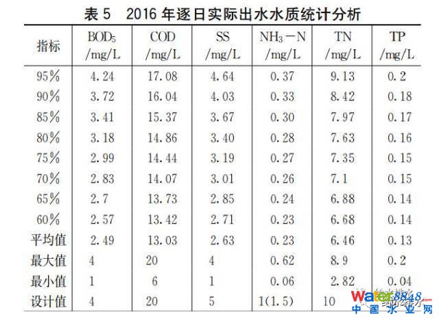 工程2016年逐月實(shí)際出水水質(zhì)見(jiàn)表4;對(duì)2016年逐日實(shí)際出水水質(zhì)進(jìn)行數(shù)理統(tǒng)計(jì)分析,結(jié)果見(jiàn)表5。