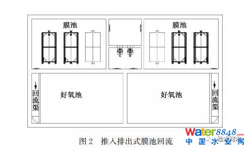 (4)膜池回流采用推入排出式(見(jiàn)圖2),傳統(tǒng)膜池為方便回流,配水渠需繞到膜池另一側(cè),配水渠和回流渠水力停留時(shí)間較長(zhǎng),土建量也較大,采用推入排出式可節(jié)省土建量,方便膜池的回流。
