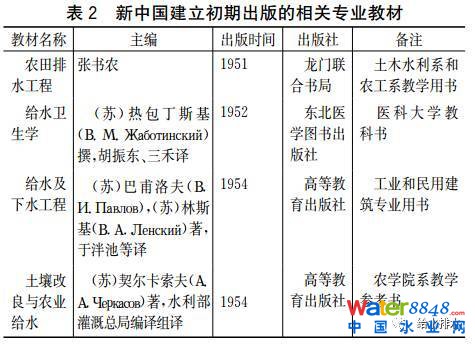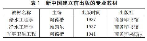 新中國(guó)建立前出版了少量的衛(wèi)生工程學(xué)科的專業(yè)教材(見(jiàn)表1)。在1952年專業(yè)建立之前及專業(yè)創(chuàng)辦初期,有一些相關(guān)專業(yè)或從蘇聯(lián)教材翻譯的其他專業(yè)教材(見(jiàn)表2)。