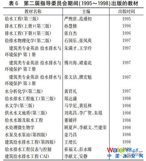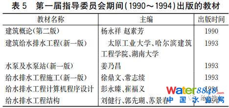 1989年,教材編審委員會(huì)更名為“全國(guó)高等學(xué)校給水排水工程學(xué)科專業(yè)指導(dǎo)委員會(huì)”。第一屆指導(dǎo)委員會(huì)主要工作仍是教材建設(shè),期間組織出版的教材有6部,見(jiàn)表5。