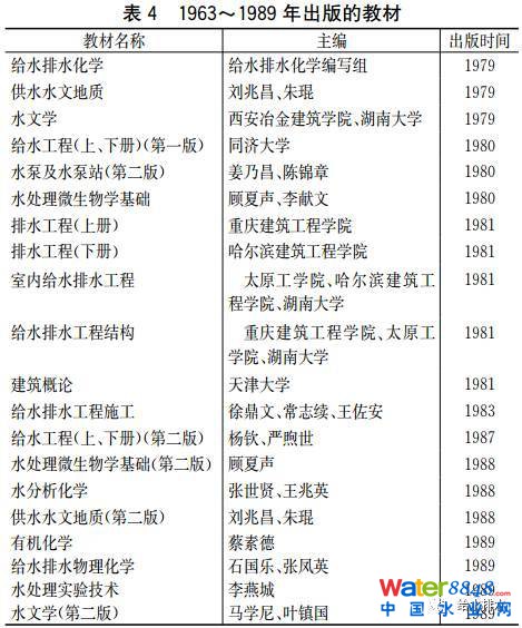 1963年建筑工程部教育司設(shè)立了給排水專業(yè)教材編審委員會(huì),負(fù)責(zé)組織全國(guó)給排水專業(yè)教材選題、編寫(xiě)和審查,在“文革”期間停止了活動(dòng)。1978年教材編寫(xiě)工作恢復(fù)。1981年設(shè)立城鄉(xiāng)建設(shè)環(huán)境保護(hù)部“高等工業(yè)學(xué)校給水排水及環(huán)境工程類”專業(yè)教材編審委員會(huì),組織編寫(xiě)了一系列專業(yè)課和專業(yè)基礎(chǔ)課的統(tǒng)編教材。1963~1989年間共出版教材20部(見(jiàn)表4)。(本文中表4~表11所列教材皆由中國(guó)建筑工業(yè)出版社出版)