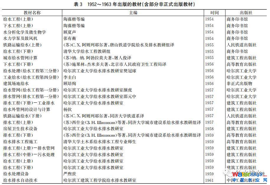 1952年后,為了解決給排水專業(yè)教材急需的問(wèn)題,一些高校和政府主管部門組織翻譯出版了一批蘇聯(lián)教材,同時(shí)也編著出版了一批教材,為給排水專業(yè)的教學(xué)提供了基礎(chǔ)(見(jiàn)表3)。