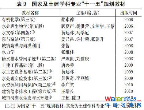 本屆指導(dǎo)委員會(huì)組織編寫(xiě)了部分主干課程系列推薦教材,共規(guī)劃立項(xiàng)16部推薦教材,其中13部教材被評(píng)為普通高等教育土建學(xué)科專業(yè)“十一五”規(guī)劃教材(其中7部同時(shí)為普通高等教育 “十一五”國(guó)家級(jí)規(guī)劃教材)(建人函[2007]83號(hào))。這批教材充分吸收給排水專業(yè)的最新科技成果,并體現(xiàn)出本專業(yè)的工程特色(見(jiàn)表9)。