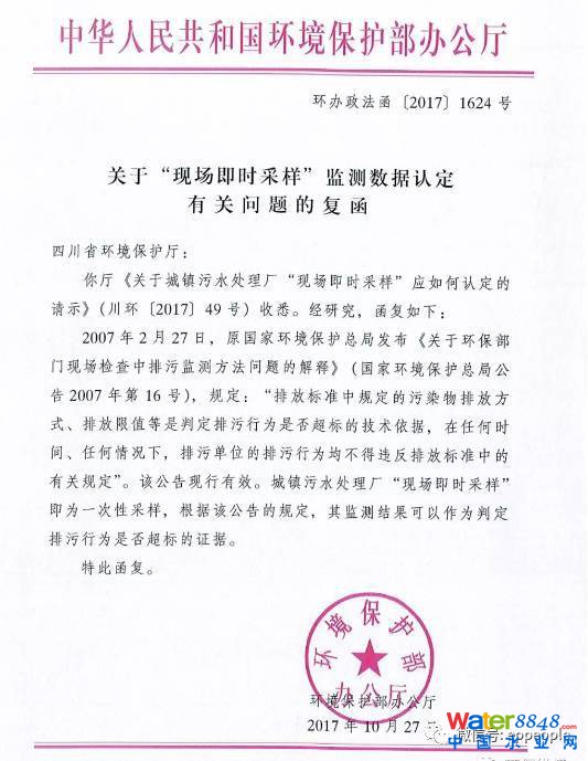 環(huán)保部復(fù)函:城鎮(zhèn)污水處理廠“現(xiàn)場(chǎng)即時(shí)采樣”即為一次性采樣,其監(jiān)測(cè)結(jié)果可以作為判定排污行為是否超標(biāo)的證據(jù)