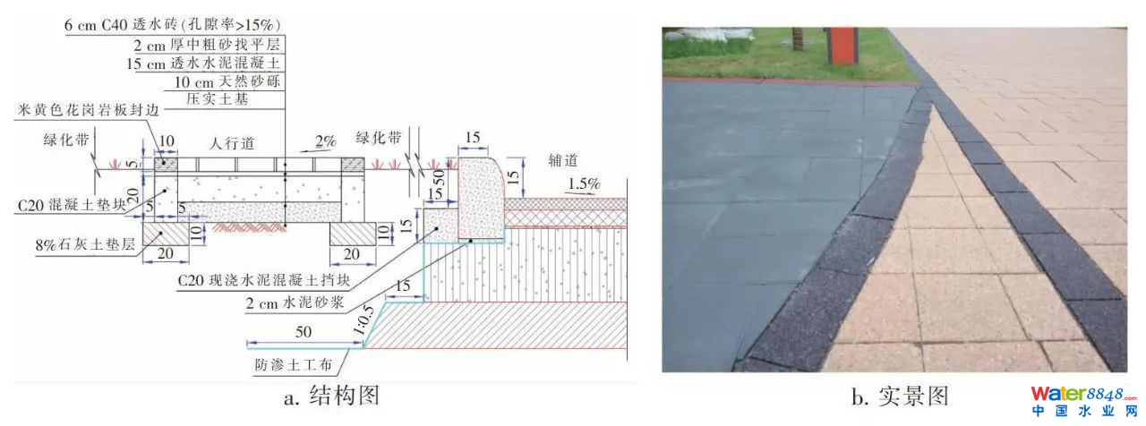 圖14 透水人行道結(jié)構(gòu)圖及實(shí)景圖