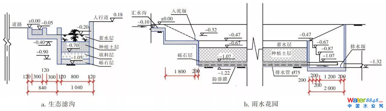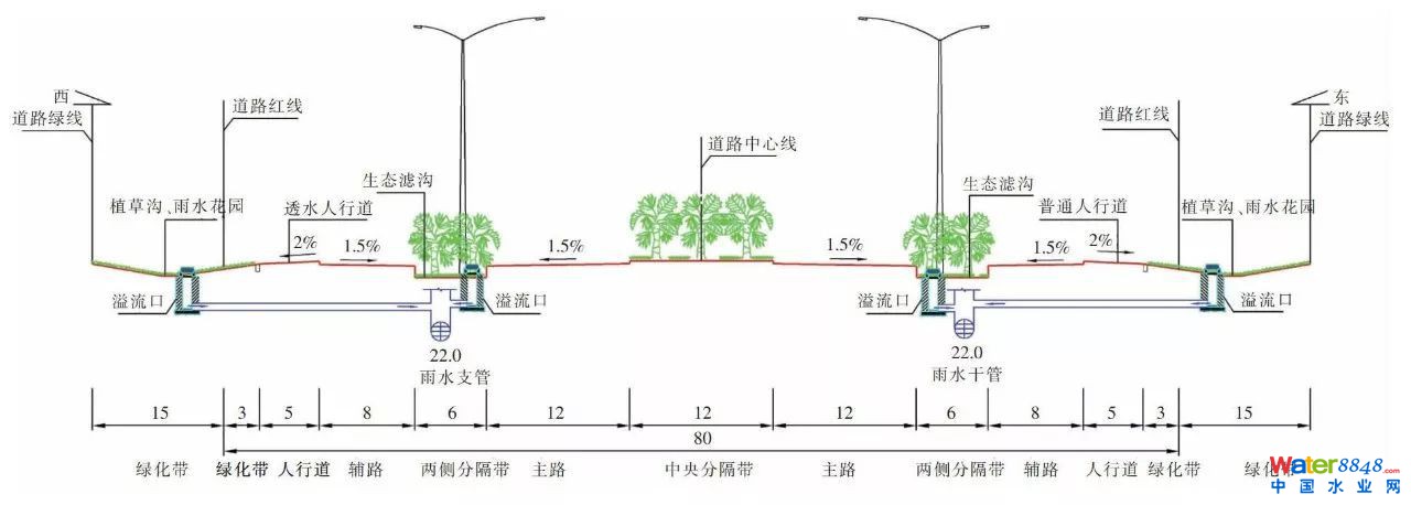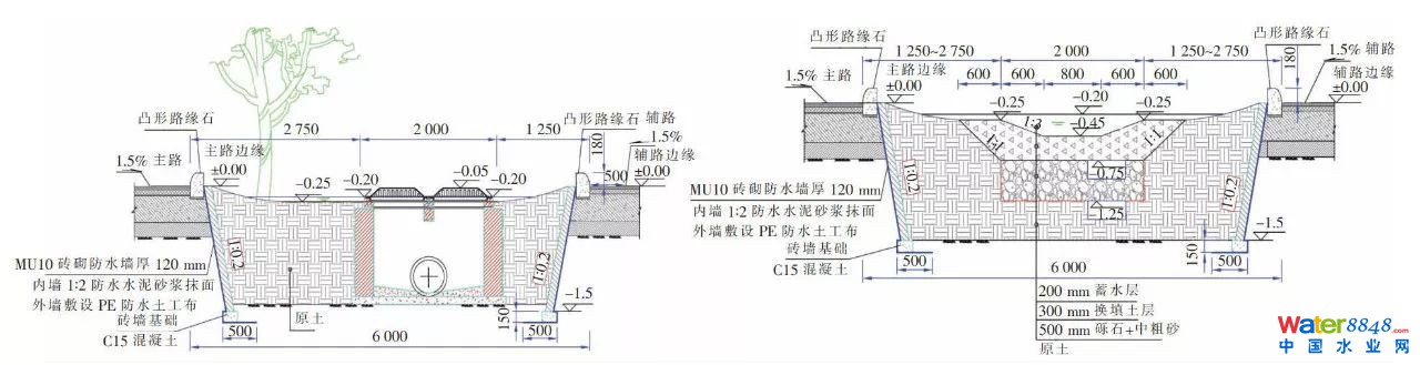 按照國(guó)家“海綿城市”建設(shè)試點(diǎn)要求,結(jié)合道路斷面、周圍環(huán)境及兩側(cè)用地規(guī)劃,本區(qū)域內(nèi)市政道路均按“低影響開發(fā)(LID)”理念進(jìn)行設(shè)計(jì),采用的主要技術(shù)有生態(tài)濾溝、雨水花園、透水路面等,典型“海綿城市”道路橫斷面設(shè)計(jì)見圖6。