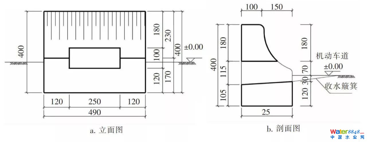 為了使路面雨水快速匯流入綠化帶內(nèi),設(shè)計(jì)在道牙上按照計(jì)算徑流量進(jìn)行開孔,約20m設(shè)置一處進(jìn)水口,每處連續(xù)2~3個(gè)路緣石開孔,或采用道牙直接斷口的形式,見圖10。