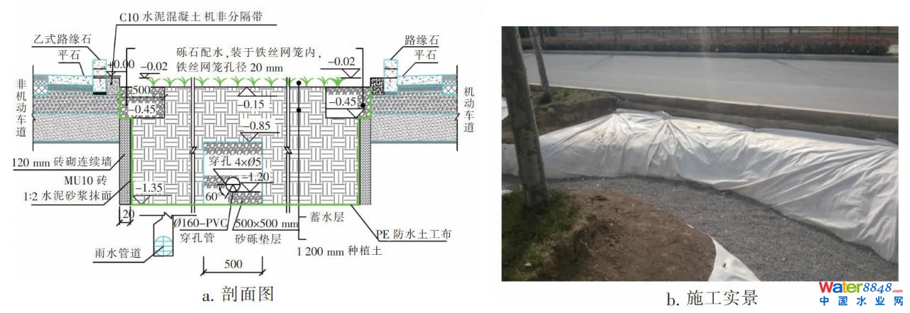 圖16 防滲型生態(tài)濾溝剖面圖和施工實(shí)景照片