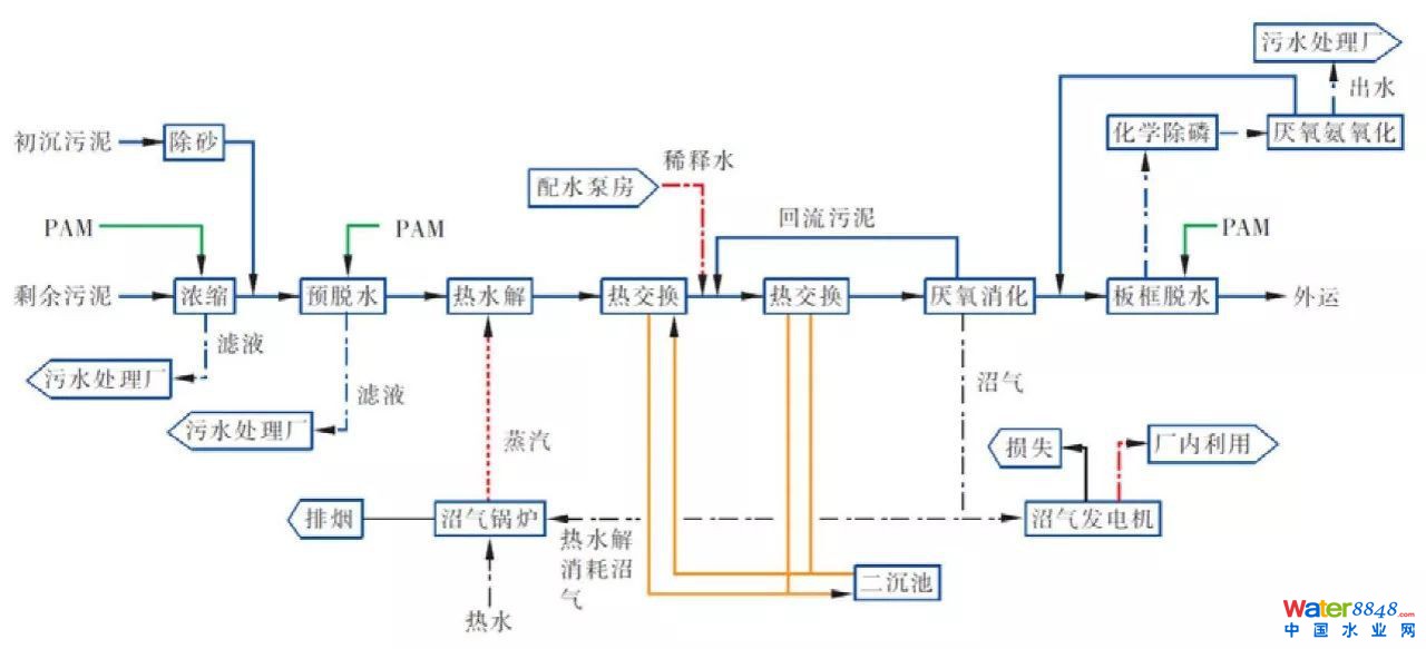 北京市某污水處理廠處理規(guī)模為60萬噸,污泥產(chǎn)量約為878噸/日,同時接收其他廠外運(yùn)污泥342噸/日,總處理規(guī)模1220噸/日(以含水率80%計,不含廠內(nèi)污泥系統(tǒng)回流量),污泥處理工藝采用濃縮+預(yù)脫水+熱水解+厭氧消化+板框脫水(見圖1)。剩余污泥進(jìn)入污泥濃縮、預(yù)脫水系統(tǒng),經(jīng)過濃縮機(jī)濃縮后,與經(jīng)過除砂的初沉污泥混合,利用預(yù)脫水機(jī)脫水與外廠輸送的脫水污泥混合后進(jìn)入熱水解系統(tǒng)。熱水解處理后的污泥經(jīng)過