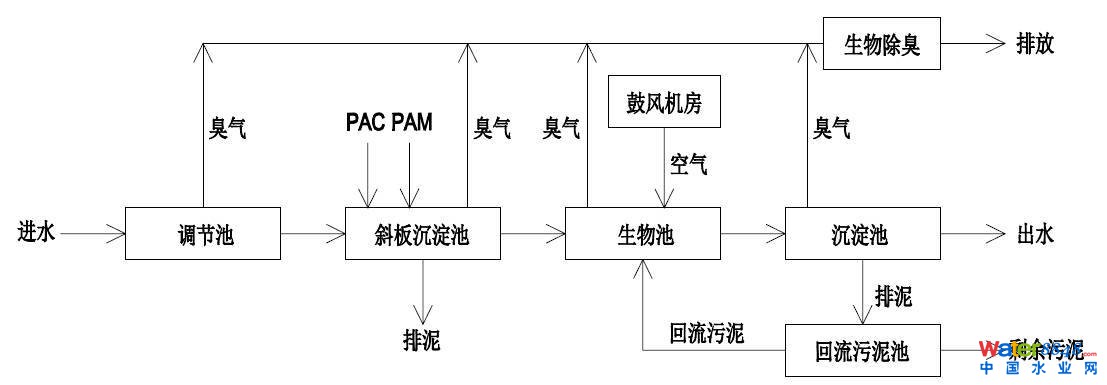 根據(jù)經(jīng)驗水質(zhì)數(shù)據(jù),最初選定技術(shù)路線為進(jìn)水—調(diào)節(jié)池—斜板沉淀池— 一段生物池— 一段沉淀池—二段生物池—二段沉淀池—出水。脫水后的污泥消化液中除氨氮濃度比較高外,還有較高TP、SS、COD,為了保證反應(yīng)器的脫氮效果,在前端增加混凝沉淀處理單元,去除TP、SS。然后進(jìn)入一段生物池和一段沉淀池,去除COD。將TP、SS、COD去除后進(jìn)入二段生物池和二段沉淀池進(jìn)行脫氮。通過中試運(yùn)行結(jié)果發(fā)現(xiàn),對于C/N比不高的污水,一段反應(yīng)池的COD去除率在20-30%之間,此工藝流程僅適用于C/N比高的污水。