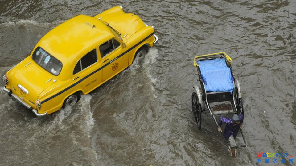 出租車:十月份的一個(gè)雨天,加爾各答的黃色出租車與人力車在水中行走。它們形成了鮮明的對(duì)比。