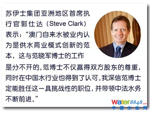 范博士在澳門(mén)自來(lái)水工作的16年間,不僅成功與澳門(mén)政府續(xù)簽20年的專(zhuān)營(yíng)合同,同時(shí)他還致力于改革創(chuàng)新、積極完善公司的管理和服務(wù),使其成為中國(guó)水行業(yè)的標(biāo)桿和典范,也正是因?yàn)榘拈T(mén)自來(lái)水項(xiàng)目的成功,使其股東蘇伊士及兄弟公司中法水務(wù)的品牌形象在國(guó)內(nèi)得以快速提升,這對(duì)后期中法水務(wù)拓展國(guó)內(nèi)水務(wù)市場(chǎng)具有非凡意義。
