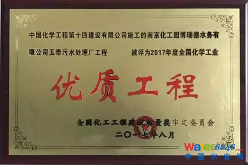 玉帶污水處理廠項(xiàng)目于2015年10月18日開(kāi)工,由中國(guó)化學(xué)工程第十四建設(shè)有限公司承建,施工過(guò)程中公司及承建單位嚴(yán)格把握安全、質(zhì)量及進(jìn)度要求,于2016年12月29日工程竣工,整個(gè)項(xiàng)目施工零事故,各項(xiàng)質(zhì)量指標(biāo)完全符合規(guī)范,2017年8月被全國(guó)化工工程建設(shè)質(zhì)量獎(jiǎng)審定委員會(huì)評(píng)為2017年度全國(guó)化學(xué)工業(yè)優(yōu)質(zhì)工程獎(jiǎng)。
