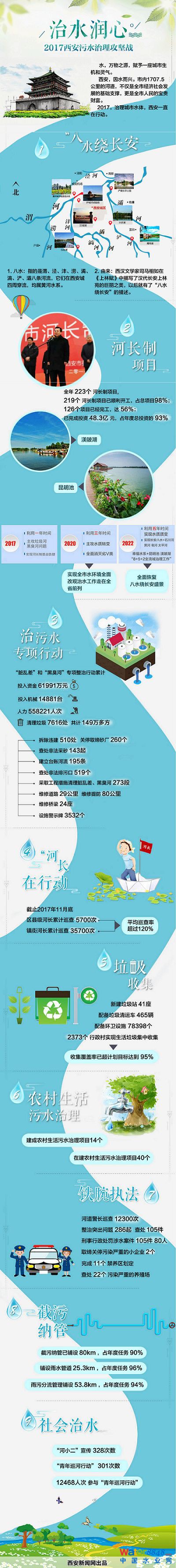 西安市境內(nèi)河網(wǎng)密集,有名稱的河流共116條,面積在10平方公里以上的河道總長1707.5公里。水,不僅是全市經(jīng)濟(jì)社會發(fā)展的基礎(chǔ)支撐,更是全市人民的寶貴財富。管護(hù)好“長安八水”和堅決打贏污水治理攻堅戰(zhàn),是西安市2017年的一項重大工作。