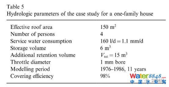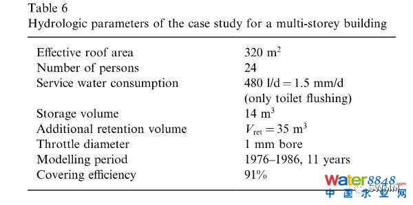 單戶和多層住房?jī)煞N類型的建筑在1976年到1986年間的年水量平衡得到了計(jì)算。在這兩個(gè)案例中,雨水存貯池都附加提供了lmm節(jié)流閥的調(diào)蓄容積。表格5和6給出了建筑的各個(gè)參數(shù)。水量平衡包括降雨,屋面的濕潤(rùn)損失,蒸發(fā),雨水使用,節(jié)流閥的溢流水量和飲用水補(bǔ)水。