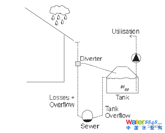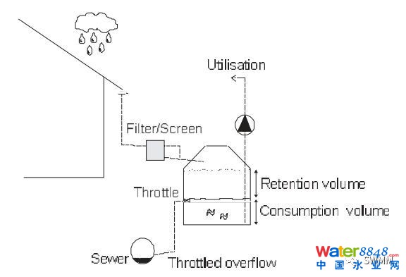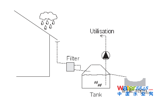 在建筑中安裝的一座典型雨水利用系統(tǒng)通過(guò)提供沖廁和綠地用水來(lái)節(jié)約飲用水,當(dāng)被安裝在私用住宅時(shí),它還要提供洗滌用水。圖1展示了雨水收集利用系統(tǒng)的原理。屋面徑流機(jī)械地通過(guò)過(guò)濾器或者格柵進(jìn)行粗略收集。市場(chǎng)上提供了許多各種各樣的雨水收集系統(tǒng),能夠根據(jù)水力特性對(duì)它們進(jìn)行系統(tǒng)分類: