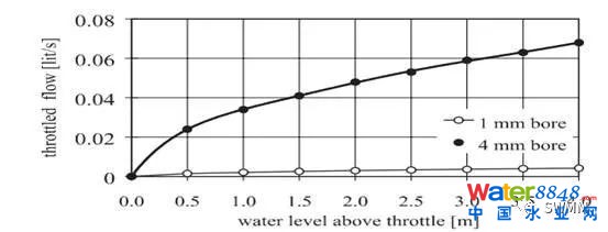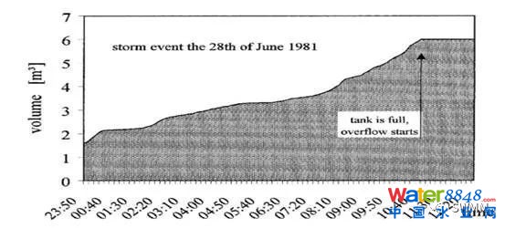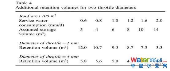 為了避免水池完全充滿后會(huì)出現(xiàn)溢流的缺點(diǎn),人們?cè)谫A存池中引入了附加的調(diào)蓄容積(Mall-Beton,1999b)。通過(guò)對(duì)模擬期間最極端降雨情景下的水位過(guò)程線(圖13)和水池中的水位圖(圖14)的檢驗(yàn)結(jié)果,說(shuō)明了貯水容積對(duì)徑流產(chǎn)生的影響。附加的9.5m3調(diào)蓄容積會(huì)將溢流量削減至0。表格4給出了與節(jié)流閥直徑為1mm和4mm相對(duì)應(yīng)的調(diào)蓄容積。根據(jù)Torricelli(1646)的描述,節(jié)流閥是帶有尖端小圓孔的裝置。圖15描述了受水位控制的節(jié)流流量。當(dāng)想達(dá)到95%-99%這樣高的系統(tǒng)效率時(shí),才需要表格4中給出的相對(duì)應(yīng)的高用水貯存體積。對(duì)于普通住戶,經(jīng)濟(jì)合理的貯存容積不超過(guò)6m3/100m2Ar。當(dāng)需要灌溉用水時(shí),應(yīng)該提高水池的貯存能力。為水池溢流提供調(diào)蓄容積的其它可能方法是在水池的周圍區(qū)域建造碎石床(Mall-Beton,1999b)。由于土壤的滲透能力在以后會(huì)成為限制性因素,所以不采用局部土壤閥門滲透的方法。