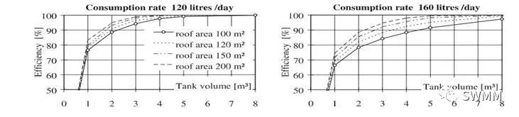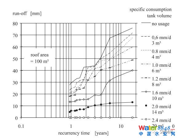 圖9顯示了在一系列的貯水容積定額中,水池溢流量與日用水量定額的比例關(guān)系。對(duì)于四人入住且其屋面面積達(dá)到100m2的房屋建筑,如果沖廁用水需求量為25L/(人·d),則可以減少44%的屋面徑流,且只需要1m3/100m2的水池容積。,當(dāng)用水量很高時(shí),水池容積則增加到5m3/100m2,剩余的溢流量可以削減到少于徑流容積的15%。
