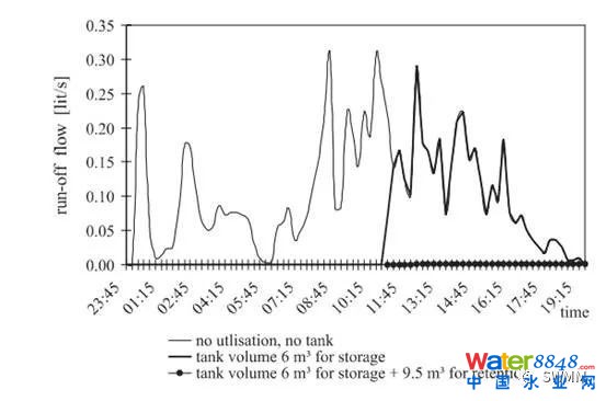 圖13 對(duì)屋面面積Ar=200m和特定用水量1mm/d的10年模擬過(guò)程中最強(qiáng)降雨的徑流水文過(guò)程線