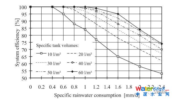 家用平均水量取決于設(shè)備使用年限,家用設(shè)備的類型,變化范圍為100-145L/(人·天)(Herrmann 和Schmida,1996年;HMUEB,1994)。圖6描述了一系列工業(yè)水用水效率所對(duì)應(yīng)的系統(tǒng)效率、貯存容積和屋面面積之間的關(guān)系。為了將不同的日用水量和屋面面積簡(jiǎn)化到一個(gè)參數(shù)組中,有必要在日用水量Qd(1/d)和有效屋面面積之間建立關(guān)系Qd/Ar=Qs,得到的日用水量定額Qs的單位為mm/d。貯水容積V與屋頂面積Ar相關(guān),可以得到貯水容積定額Vs=V/Ar,它也被用于確定集中式分布雨水調(diào)蓄池的尺寸。得到的數(shù)據(jù)在圖7中進(jìn)行了描述:這里你發(fā)現(xiàn)系統(tǒng)的效率與用水速率相關(guān),而不受屋面范圍的影響。對(duì)于使用4-6m3貯水容積的單獨(dú)用戶來(lái)說(shuō),飲用水的平均節(jié)水率在30%到60%之間,這取決于用水習(xí)慣和有效屋面面積。當(dāng)?shù)玫阶畲蟮南到y(tǒng)效率時(shí),我們可以從表格3中獲取所需要的水池容積。圖8給出了在居住有兩個(gè)年輕人和兩個(gè)孩子的建筑中檢測(cè)到的用水?dāng)?shù)據(jù),他們居住在位于巴伐利亞州法蘭克尼亞市上游的米斯特巴赫市。