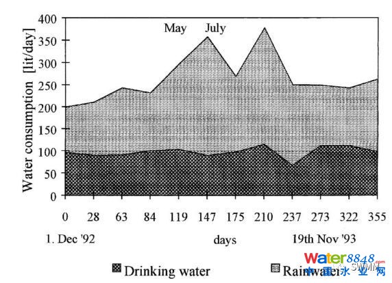 圖8 1993年巴伐利亞州法蘭克尼亞市上游米斯特巴赫市四人住房的日用水量。貯水容積6m3,屋面面積Ar=150m2.平均總用水量(=雨水加飲用水)=66L/(人·d)(數(shù)據(jù)源自米斯特巴赫的B.Koppe)。