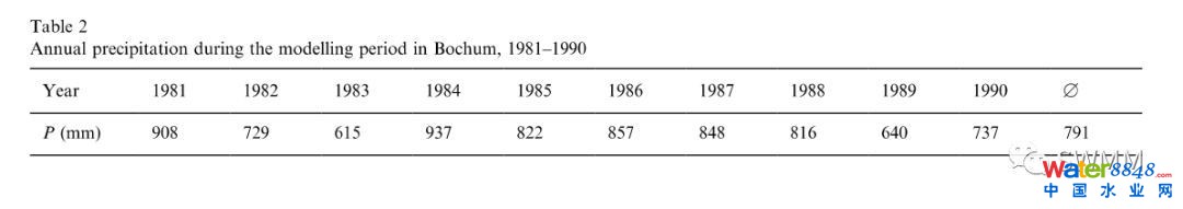 計(jì)算結(jié)果是在基于長(zhǎng)達(dá)十多年的連續(xù)降雨數(shù)據(jù)上所得出的。通過(guò)運(yùn)行有水文降雨徑流背景資料的RWIN模型來(lái)進(jìn)行模擬。模型賦值5分鐘徑流間隔的輸入降雨數(shù)據(jù),用一系列的存儲(chǔ)數(shù)據(jù)畫出單位過(guò)程線。根據(jù)屋面的材料和坡度,能夠?qū)駶?rùn)屋面的水量損失進(jìn)行設(shè)置。通過(guò)建立蒸發(fā)模型,可以將存留在屋面上的雨水損失設(shè)置為空值。表格1給出了水文數(shù)據(jù)。表格2給出了模擬期間的年降雨量。