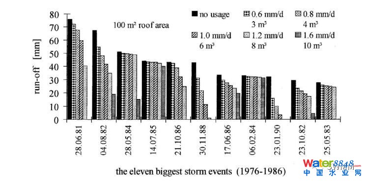 聯(lián)合表格3中最大的覆蓋率,圖10給出了溢流容積和溢流事件次數(shù)之間的關(guān)系。對(duì)于排水系統(tǒng),我們更感興趣的是它在強(qiáng)降雨期間的運(yùn)行效能。因此,我們分析了在10年的模擬過(guò)程中發(fā)生的11次最大徑流事件。圖11給出了在這些極端降雨事件中所得到的徑流容積減少量?梢圆斓讲煌姆磻(yīng):在用水速率為1.6mm/d時(shí)沒(méi)有徑流事件發(fā)生:1988年11月30日,1981年6月28日和1990年1月23日。其它的徑流事件得到增強(qiáng)或減弱:1985年7月14日,1984年2月6日和1984年5月28日。這些反應(yīng)是由于在暴雨事件之前貯存池中的雨水量水平所導(dǎo)致的。圖12分析了一定的徑流容積在相應(yīng)周期下所對(duì)應(yīng)的的徑流削減量。周期是根據(jù)經(jīng)驗(yàn)頻率公式得到的。即使10年周期這樣的極端事件,當(dāng)運(yùn)行雨水利用系統(tǒng)時(shí),徑流容積會(huì)得到大量的削減。