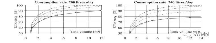 圖6 系統(tǒng)效率和貯存容積在不同用水速率下的關(guān)系