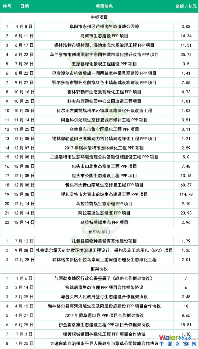 同樣,蒙草生態(tài)那拿下了22個項目和3個預中標項目,共計總投資為336.12億元,略高于鐵漢生態(tài)。同時,蒙草生態(tài)還有簽署8個未落實至項目的框架協(xié)議。2017年年初,蒙草生態(tài)簽署了多個框架協(xié)議,不少協(xié)議已經(jīng)落地成為中標的項目。待剩下的框架協(xié)議落地,又可為蒙草生態(tài)帶來近50億的項目。