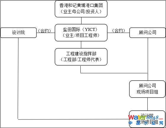 顧問公司對(duì)業(yè)主直接負(fù)責(zé),業(yè)主通過顧問公司管理設(shè)計(jì)院。月度例會(huì)上,業(yè)主和顧問公司同時(shí)向投資人和記黃埔港口集團(tuán)匯報(bào)工作。二期工程部對(duì)外稱“建設(shè)指揮部”,行使行政職能;對(duì)內(nèi)則行使“工程師代表”職責(zé)。(工程設(shè)計(jì)階段項(xiàng)目組織架構(gòu)如圖10所示)