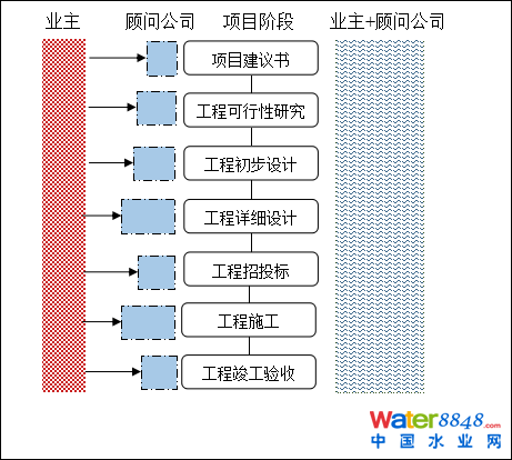 基礎(chǔ)設(shè)施項(xiàng)目的發(fā)展,從規(guī)劃立項(xiàng)開始,進(jìn)入工程設(shè)計(jì)、施工,再到運(yùn)營(yíng)維護(hù),是一個(gè)系統(tǒng),其內(nèi)在過程密切聯(lián)系。對(duì)于具體的工程項(xiàng)目而言,由于政策管理等因素影響,其發(fā)展階段通常是人為分割的。傳統(tǒng)的工程顧問項(xiàng)目團(tuán)隊(duì)是響應(yīng)業(yè)主要求,割裂性地參與部分階段的技術(shù)咨詢工作,這種模式對(duì)把握項(xiàng)目全生命周期的優(yōu)化和價(jià)值,具有一定的缺陷和局限性。而突破傳統(tǒng)模式的有效方法,就是采用業(yè)主+顧問公司的一體化項(xiàng)目管理和咨詢團(tuán)隊(duì),并且實(shí)施項(xiàng)目全過程咨詢的模式。(如圖2所示)