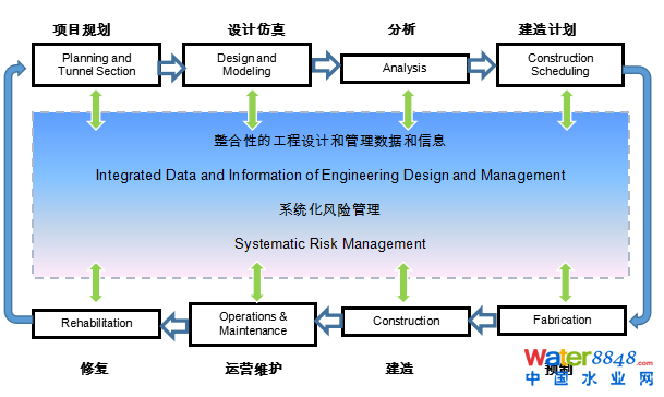 隨著大數(shù)據(jù)和BIM技術(shù)的發(fā)展和成熟,對(duì)于基礎(chǔ)設(shè)施這種復(fù)雜的工程,將更廣泛地應(yīng)用虛擬現(xiàn)實(shí)的技術(shù)進(jìn)行模擬工程方案和建造的全過程,優(yōu)化設(shè)計(jì)和施工方案。采用BIM技術(shù)可以將工程三維(幾何)技術(shù)拓展到四維(建造計(jì)劃)、五維(工程造價(jià))和六維(運(yùn)營(yíng)維護(hù)),通過大數(shù)據(jù)技術(shù)的應(yīng)用,可以整合工程全生命周期的流程,將其提升為整合性的工程數(shù)據(jù)和信息,進(jìn)而有效地實(shí)施項(xiàng)目全壽命周期設(shè)計(jì)理念和系統(tǒng)化風(fēng)險(xiǎn)管理。圖4為工程項(xiàng)目全壽命周期規(guī)劃、設(shè)計(jì)、建造和管理系統(tǒng)概念圖。