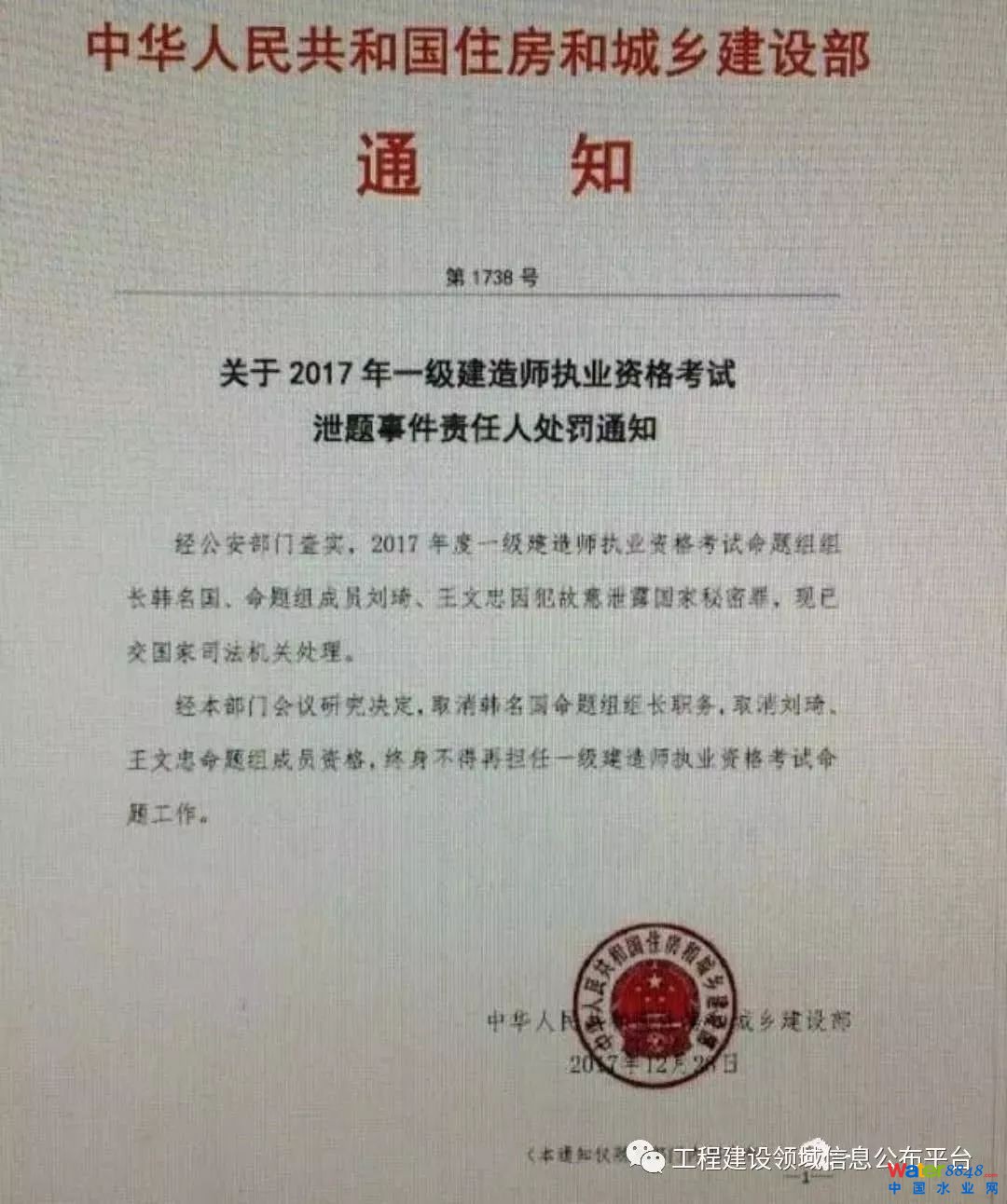 (1)最近網(wǎng)絡(luò)上流傳一份住建部第1738號通知的截圖,截圖中的文字內(nèi)容顯示:經(jīng)公安部門查實,2017年度一級建造師執(zhí)業(yè)資格考試命題組組長韓某某、命題組成員劉某、王某某因犯故意泄露國家秘密罪,現(xiàn)已交國家司法機(jī)關(guān)處理。