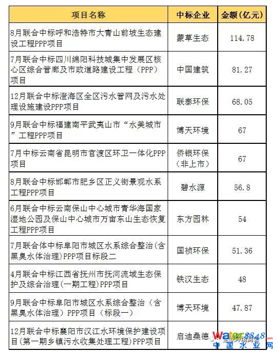 2017年環(huán)保PPP項(xiàng)目中標(biāo)金額TOP10