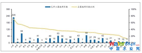2017年9月管理庫開工項(xiàng)目數(shù)各省分布及占落地項(xiàng)目數(shù)比例(單位:個(gè))