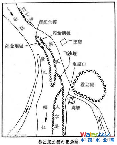 在枯水期,江水不愛往東而流,成都平原得不到灌溉。于是在江心的“離堆”向上游方向,修筑一個(gè)幾百米長(zhǎng)的大堤,這個(gè)大堤就叫做“金剛堤”,金剛堤迎著上游江水的頭部,就叫做“魚嘴”。從“魚嘴”到“離堆”之間的金剛堤,就等于把岷江水進(jìn)一步一分為二,西面的原有岷江河道,叫做“外江”;東面的河道,叫做“內(nèi)江”。其中“內(nèi)江”有人工導(dǎo)流渠的意思,每年到了枯水期,就組織人工,對(duì)“內(nèi)江”進(jìn)行掏挖,挖得比外江低,這樣,就解決了枯水期江水不愛流入寶瓶口的問(wèn)題。同時(shí),內(nèi)江在凹岸,外江在凸凹又剛好解決了泥沙淤積問(wèn)題。