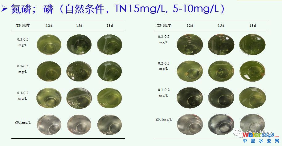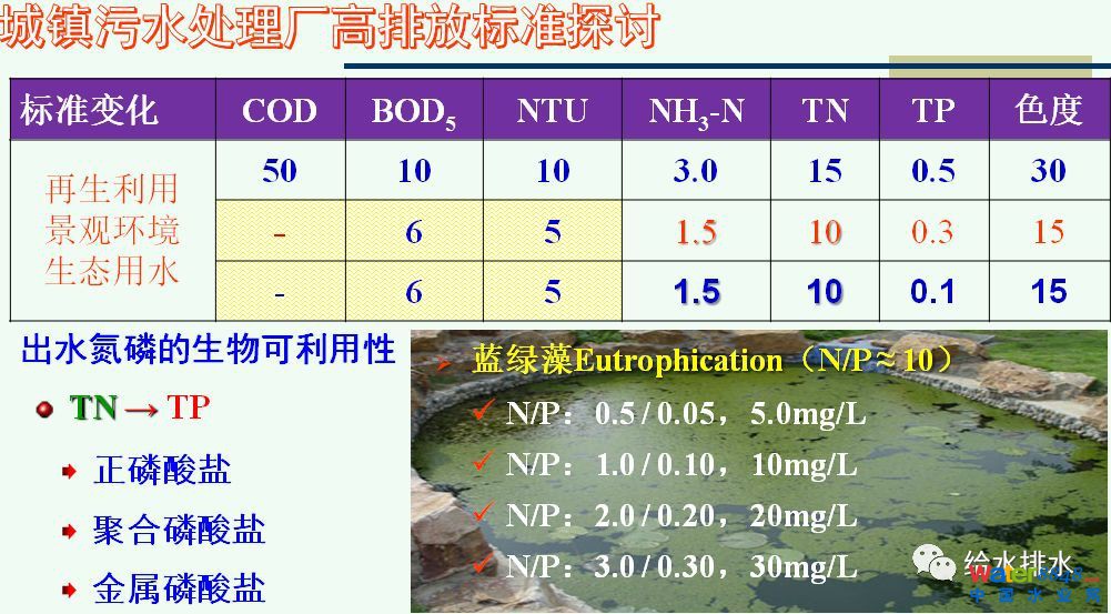 上圖池塘中,原始總磷在0.1,完全生長藻類之后把藻全部撈掉水中的磷降低到0.04,水中的磷基本上可以被藻類完全利用,所以說磷的總量控制非常重要的一個指標,這是從高排放標準以及跟再生水利用之間怎么做到均衡的關系來考慮得到的結(jié)論。也就說要達到利用的要求,磷是越低越好。