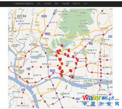 信息發(fā)布采用網(wǎng)站發(fā)布和短信發(fā)布相結(jié)合的方式,其中信息發(fā)布網(wǎng)站可通過電腦或者手機(jī)使用Internet瀏覽。深層隧道排水區(qū)域液位在線監(jiān)測(cè)系統(tǒng)是如圖3所示東濠涌深隧優(yōu)化調(diào)度系統(tǒng)的重要組成部分,發(fā)布網(wǎng)站由主頁、實(shí)時(shí)監(jiān)視、報(bào)表、系統(tǒng)設(shè)置、聯(lián)系方式等幾部分組成,可通過發(fā)布網(wǎng)站查詢液位監(jiān)測(cè)點(diǎn)的具體位置,在線查詢即時(shí)數(shù)據(jù),以及使用報(bào)表查詢各個(gè)監(jiān)測(cè)點(diǎn)的歷史數(shù)據(jù),并可通過系統(tǒng)設(shè)置功能在線查詢?cè)O(shè)備工況,以及喚醒已休眠的設(shè)備。短信發(fā)布功能則利用短信平臺(tái)執(zhí)行,在達(dá)到警戒水位的時(shí)候,采用群發(fā)短信的形式將預(yù)警短信發(fā)送給預(yù)先在系統(tǒng)中設(shè)定好的調(diào)度管理人員,使得調(diào)度人員能夠及時(shí)采取調(diào)度措施。