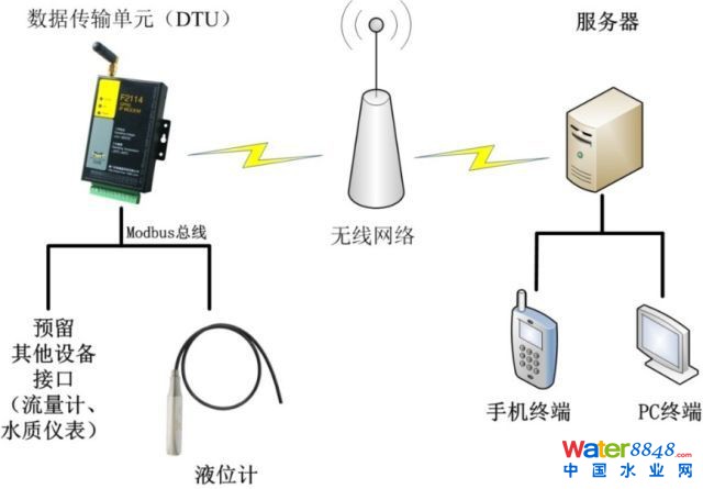 數(shù)據(jù)傳輸單元(DTU)是專門用于將串口數(shù)據(jù)轉(zhuǎn)換為IP數(shù)據(jù),通過無線通信網(wǎng)絡(luò)把數(shù)據(jù)傳輸?shù)胶笈_(tái)服務(wù)器的無線終端設(shè)備,實(shí)現(xiàn)實(shí)時(shí)監(jiān)測(cè)數(shù)據(jù)的傳輸。DTU安裝于內(nèi)澇點(diǎn)現(xiàn)場(chǎng),通過模擬量通道或通過Modbus總線技術(shù)讀取液位計(jì)實(shí)時(shí)液位數(shù)據(jù),根據(jù)預(yù)先設(shè)定的時(shí)間間隔接收從液位計(jì)傳感器傳來的液位數(shù)據(jù),再通過GPRS將數(shù)據(jù)傳輸?shù)揭苿?dòng)公司數(shù)據(jù)中心,再傳輸?shù)酵ㄓ嵎⻊?wù)器供控制臺(tái)、WEB服務(wù)器和數(shù)據(jù)服務(wù)器等使用。