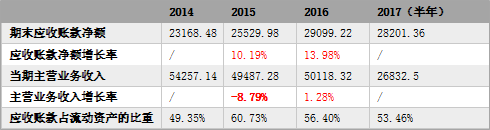 通過分析2017年招股說明書發(fā)現(xiàn),近三年,應收賬款余額占到公司流動資產(chǎn)的比例平均達到一半以上,應收賬款的增速較快,大于同期主營業(yè)務收入的增速(見表3)。