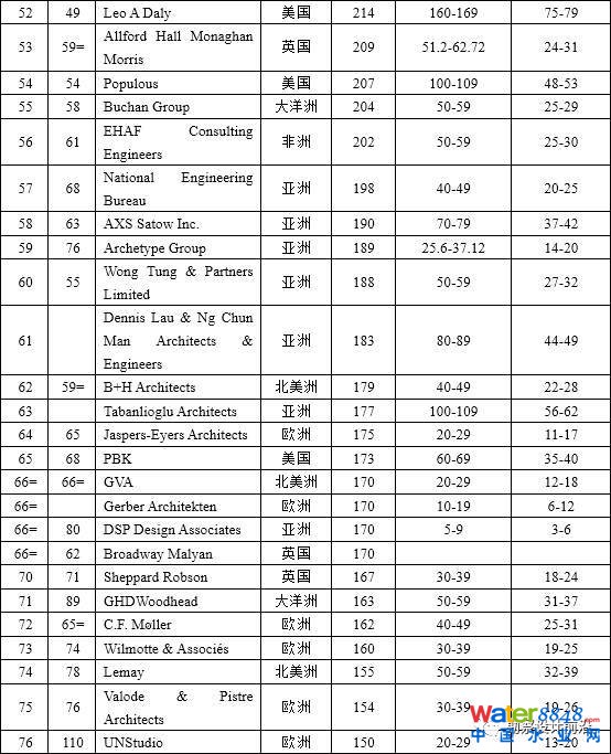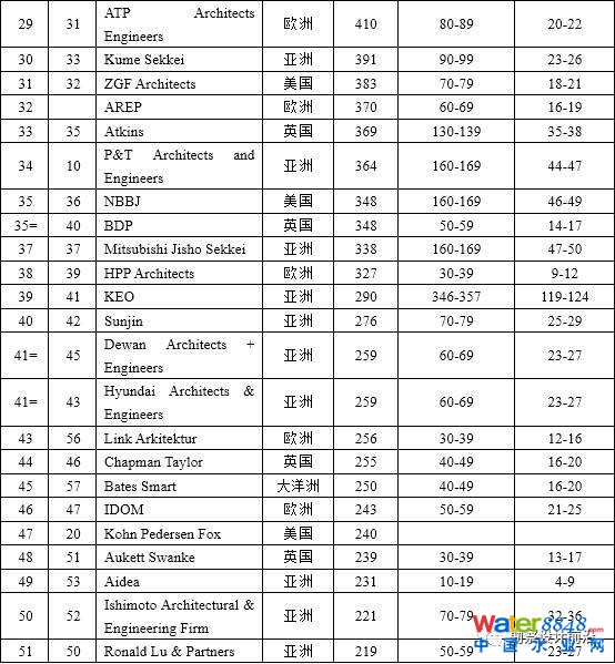 說到這,大家可能會感到奇怪,怎么中國大陸的建筑設計院一家都沒有呢,中國建筑設計院,中建系的建筑設計院,上,F(xiàn)代等,都沒上榜嗎?實際不是這樣。話說這個排名是英國的老牌建筑刊物BD統(tǒng)計的,可能是由于這個固執(zhí)的英國佬,每年調(diào)查的公司范圍比較固定,仍然局限于傳統(tǒng)英美國家,不僅榜上英國、美國公司居多,它設定的“中國”公司,也總是凱達(Aedas,第9)、巴馬丹拿(P+T Architects & Engineers,第34)、呂元祥事務所(Ronald Lu & Partners,第51)和王董(Wong Tung & & Partners,第60)和劉榮廣與伍振民建筑師事務所(Dennis Lau & Ng Chun Man Architects & Engineers,第61)這幾家出身香港的老面孔。也許他們對沒有歐美背景或并非私人經(jīng)營的企業(yè)還陌生得很?而中國的設計機構可能還需要時間獲得世界的了解和尊重。