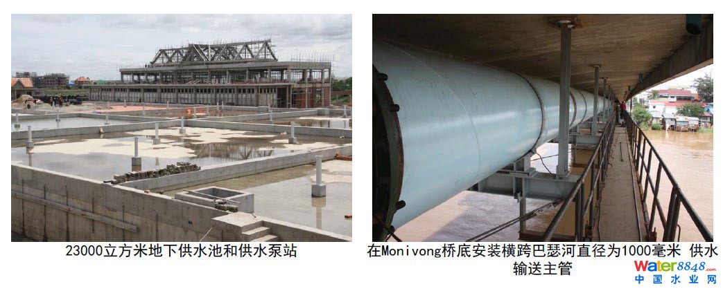 13萬立方米/天的自來水處理廠的設(shè)計(jì),建設(shè),安裝和調(diào)試,包括混合池,12組絮凝池,斜板(lamella)澄清池和砂濾器,23000立方米供水水庫,和供水泵站,包含6組傳輸泵,變頻調(diào)速器,化學(xué)儲存和計(jì)量系統(tǒng),氯氣中和系統(tǒng),22kV和400V開關(guān)柜,變壓器和電纜,儀器儀表,PLC和SCADA系統(tǒng)以及連接自來水廠與金邊現(xiàn)有供水網(wǎng)絡(luò)的2.5公里DN1600mm DICL供水傳輸管道系統(tǒng)。