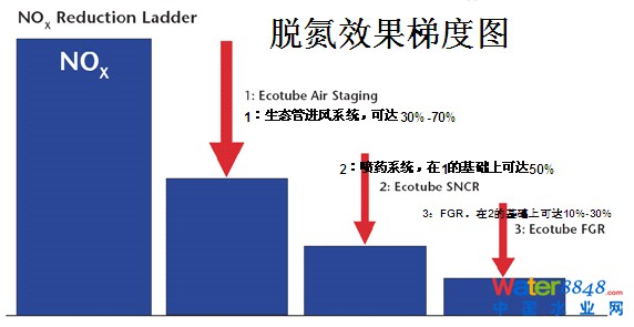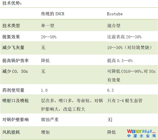 Ecotube 屬于低氮燃燒與煙氣脫硝技術(shù)相結(jié)合的技術(shù)類型,其技術(shù)特點(diǎn)如下:生態(tài)管系統(tǒng)是一種可改善燃燒工藝狀況,費(fèi)用-效益效果俱佳的工具,包括可收縮長(zhǎng)槍(生態(tài)管),它帶有可注入試劑的噴嘴。不同的試劑可通過(guò)噴嘴在高的壓力和速度下導(dǎo)入燃燒爐。生態(tài)管被置于爐內(nèi)的關(guān)鍵的位置上注入試劑,造成與燃燒產(chǎn)物激烈的混合,導(dǎo)致燃?xì)庵纬赏耆旌系耐牧鳡顟B(tài)。另外,當(dāng)從生態(tài)管中噴入氨試劑時(shí)可以脫氮,當(dāng)噴入石灰時(shí),這個(gè)系統(tǒng)可以脫硫。
